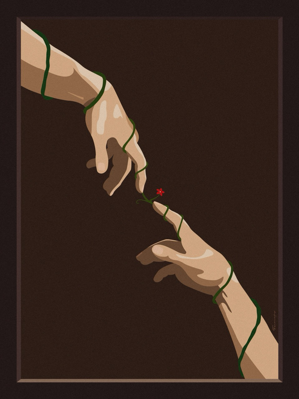Là où les deux doigts ne se touchent pas, j’ai choisi de traduire cette distance autrement, par un lien entre les deux mains.