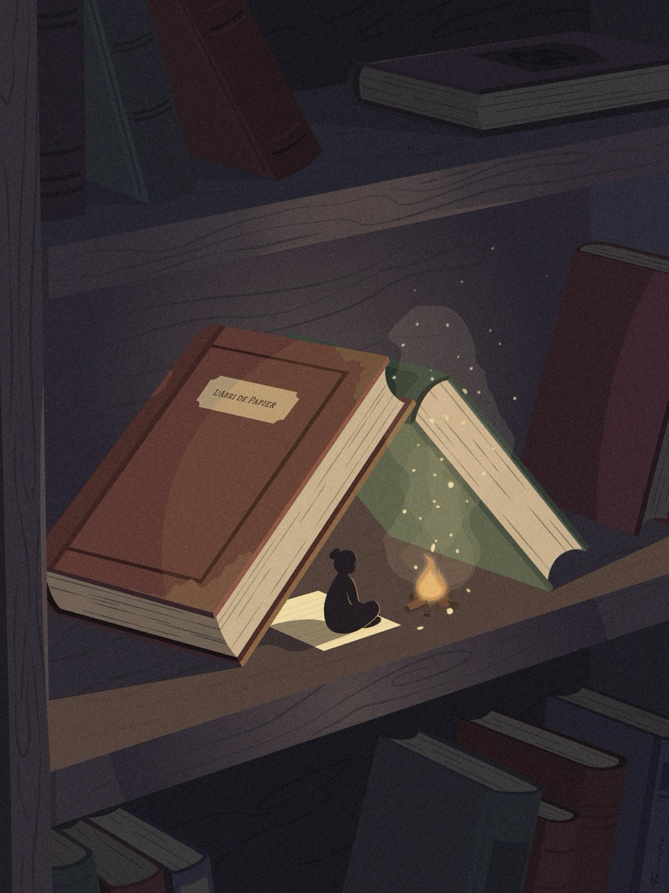 L’Abri de Papier est une illustration montrant une petite silhouette se réchauffant près d’un feu, au cœur d’une bibliothèque sombre.
